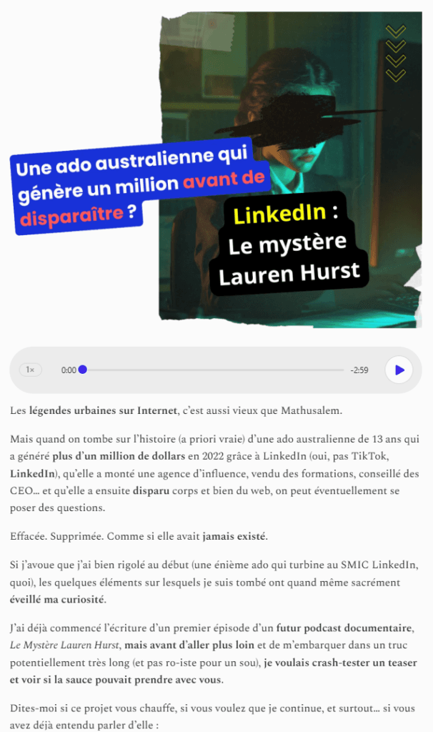Avant de me lancer à fond les ballons (d’hélium) dans la prod’, j’ai commencé par crash-tester l’idée dans ma newsletter ; j’ai raconté, sous forme de petit teasing un peu flou, l’histoire d’une ado australienne devenue une star de LinkedIn avant de disparaître ; et histoire de faire les choses bien, je proposais un petit sondage à la fin pour savoir qui ça botterait d’écouter ce genre d’ovni :