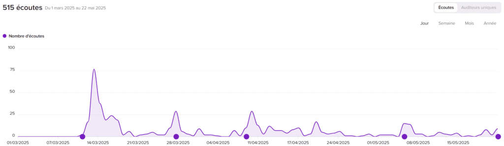 La majorité des écoutes s’est concentrée sur les deux premières semaines, au moment du lancement et de la diffusion du 2ᵉ épisode. C’est là que ma newsletter et LinkedIn ont fait leur taf : relai initial, partage organique, effet curiosité. Ensuite, la courbe s’est logiquement tassée.