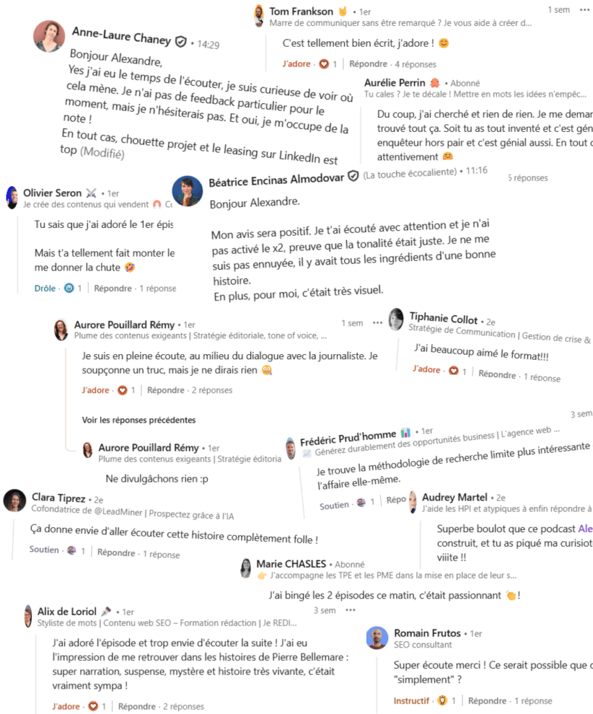 Côté retours, les messages ont été globalement très positifs comme on peut le constater précédemment ; les gens ont trouvé ça bien foutu et original. Ce que je n’ai pas eu, en revanche, ce sont des retours détaillés. J’ai posé la question en MP, demandé des feedbacks, incité à noter le podcast sur les plateformes. Peu de réponses. Rien de méchant, mais assez représentatif : dans le B2B, même quand les gens aiment, ils ne prennent pas toujours le temps de le dire. Ça fait partie du jeu.